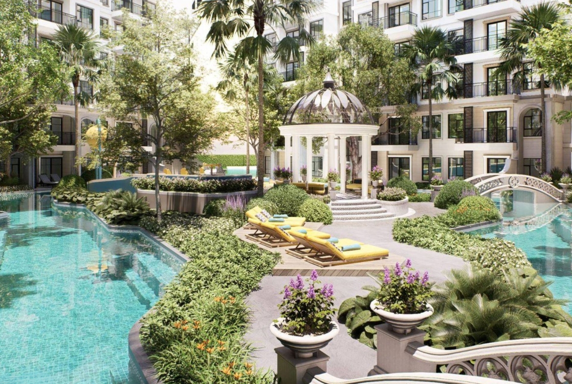Территория комплекса больше похожа на пятизвездочный курорт: несколько бассейнов, включая спортивный и панорамные на крыше, фитнес-центр, SPA, кинотеатр, коворкинг, кафе и бары. Для детей предусмотрены игровые зоны и клубы, а для владельцев домашних животных — отдельные пространства для прогулок.