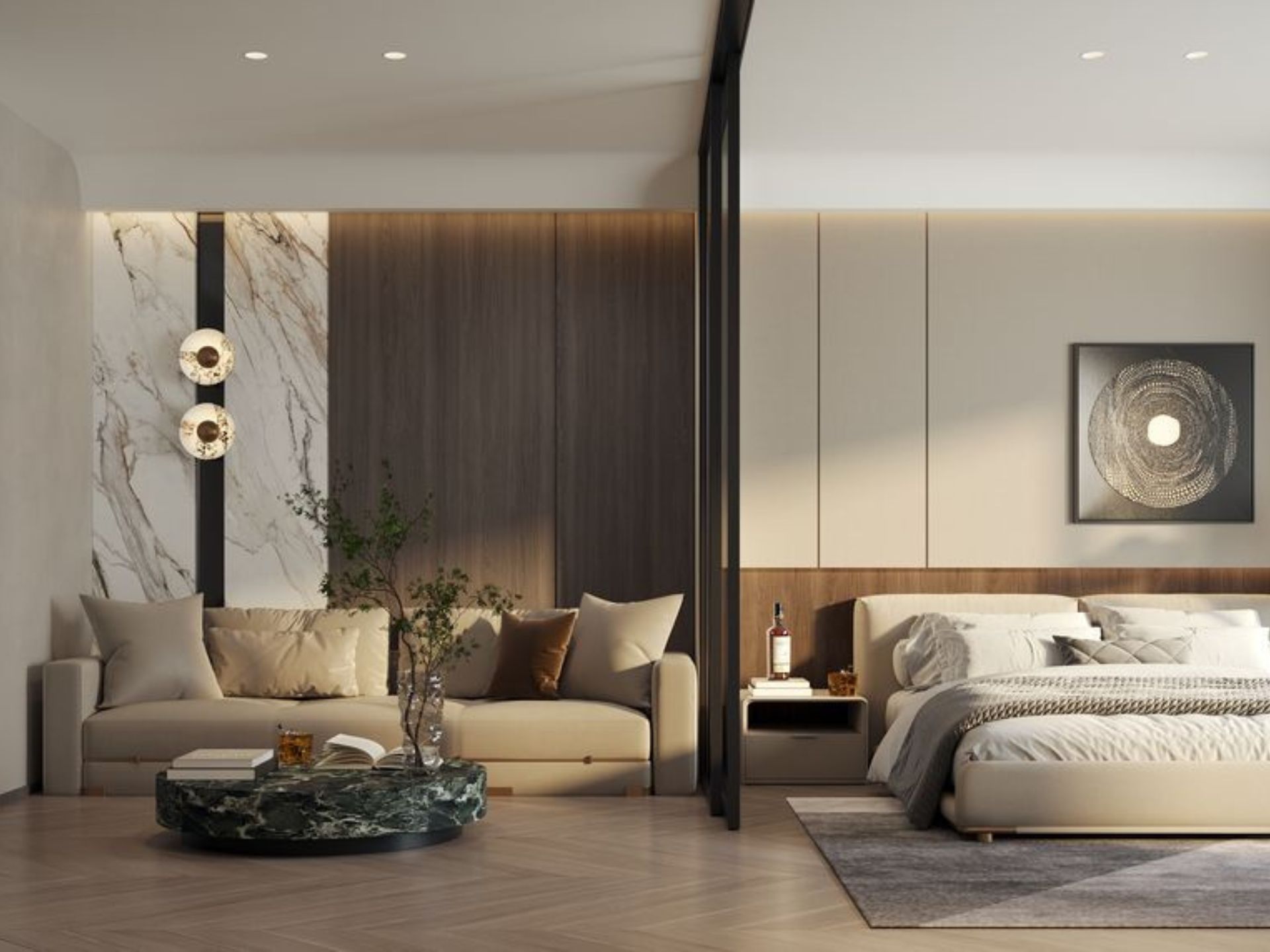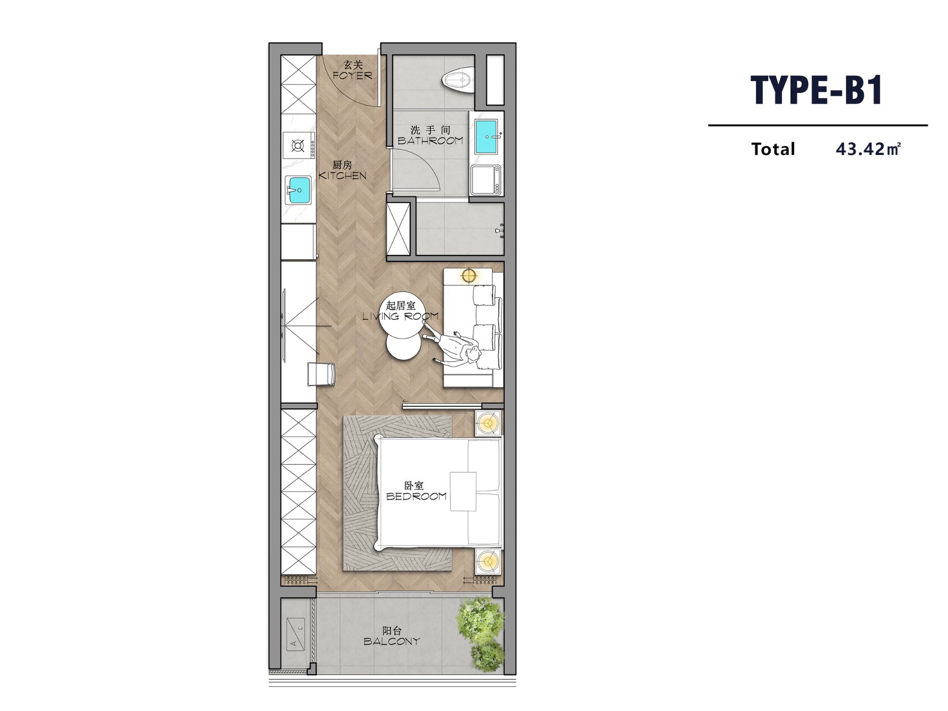 Современная линейная студия с чётким зонированием: отдельная спальная зона, компактная гостиная, полноценная кухня, ванная комната и балкон. Функциональная планировка при небольшой площади – именно то, что необходимо для долгосрочного проживания.