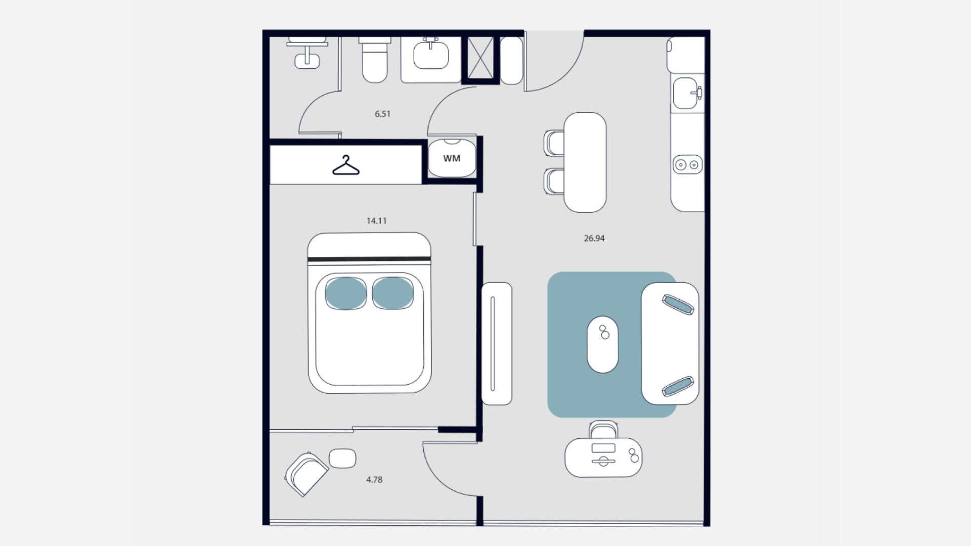Компактная квартира с открытой кухней-гостиной: кухня вдоль правой стены, обеденный остров и зона отдыха с диваном и телевизором. Отдельная спальня с двуспальной кроватью и встроенным шкафом, при ней небольшая лоджия, используемая как рабочий уголок. Планировка функциональна и оптимально использует пространство.