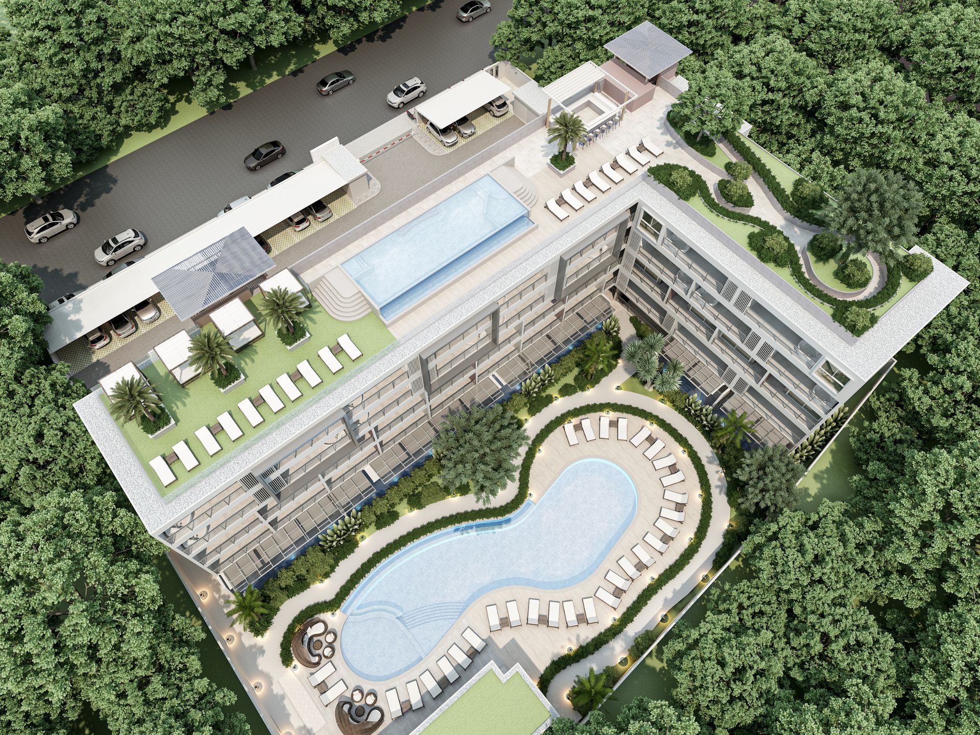 Комплекс сочетает продуманную архитектуру и продвинутую инфраструктуру: тропический сад площадью 500 м², фитнес-центр, зону гидромассажа, детский бассейн, панорамный бассейн и сад на крыше с видом на море и горы. Локация выгодно выделяется: рядом рынок свежих морепродуктов Sea Gypsy, рестораны, торговые центры, международные школы и спортивные клубы. Пляж Най Харн находится всего в 7 минутах езды.