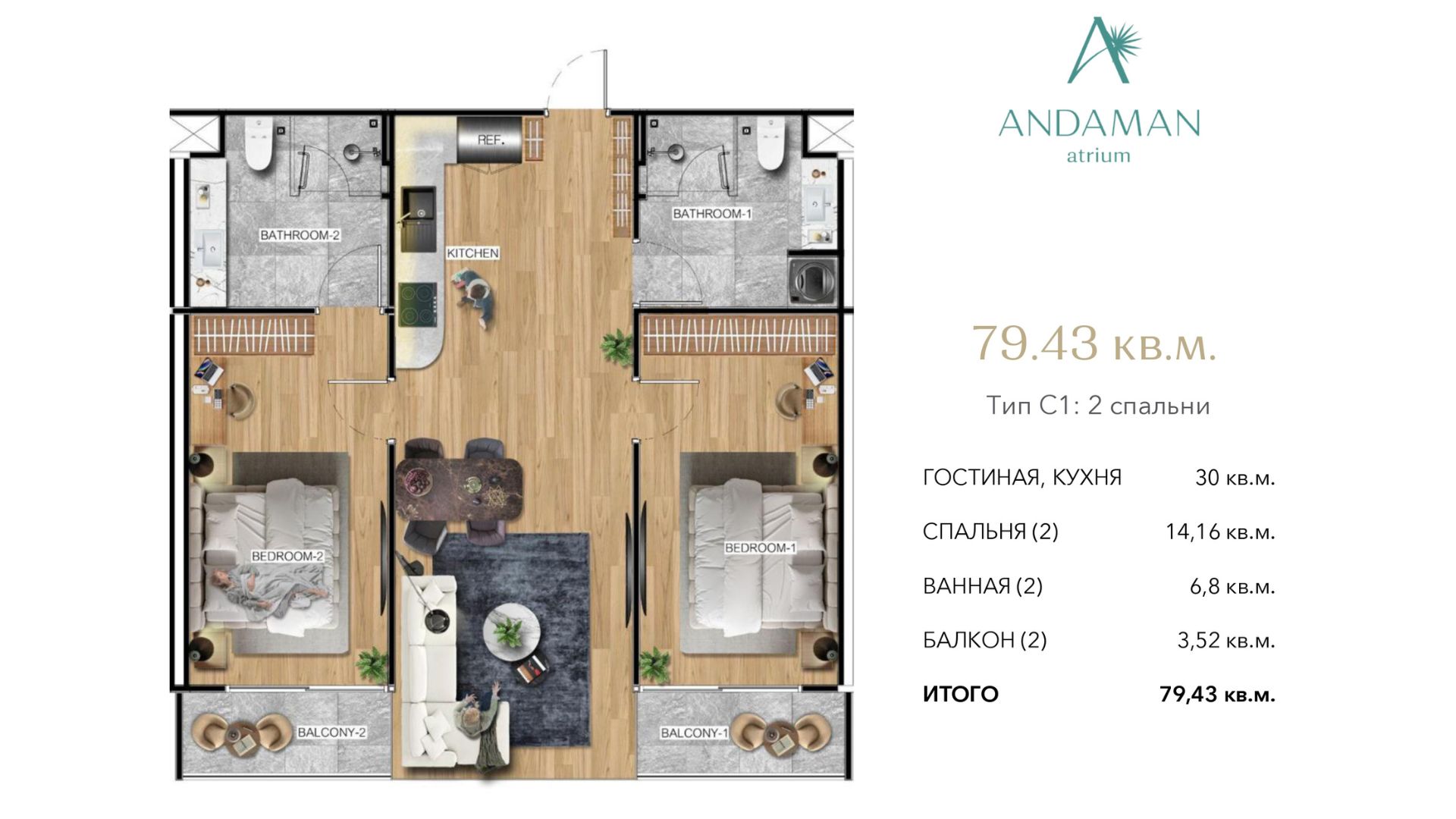 Современные премиум апартаменты в 500 метрах от пляжа Банг Тао, площадью 79 кв.м., включают в себя 2 равноценные спальни с личными балконами и 2 полноценные ванные комнаты – идеальный вариант для семьи или инвестиции под аренду.