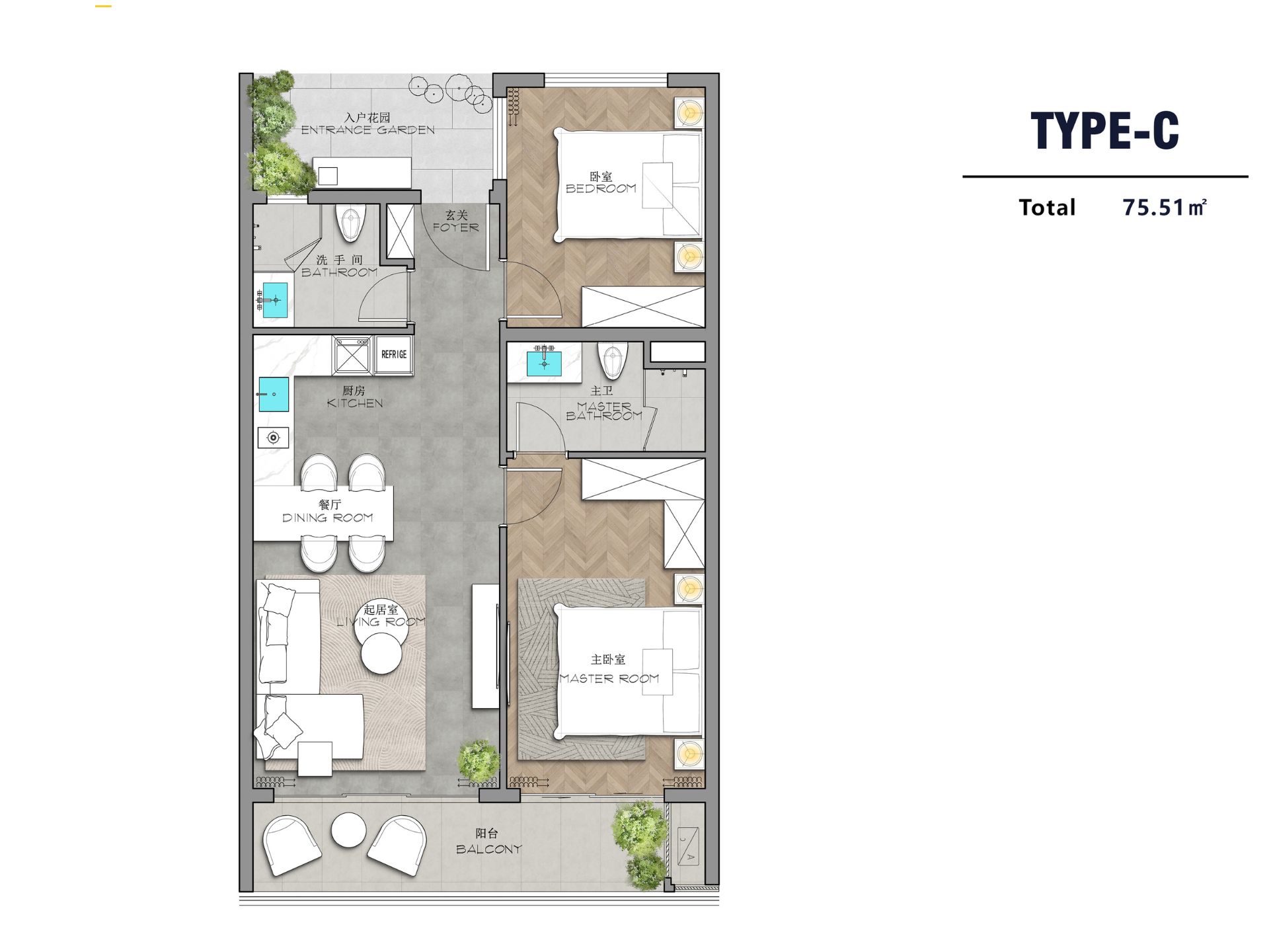 Планировка апартаментов продуманная и сбалансированная по приватности и общественным зонам, с сильной фокусировкой на комфорте, а входная садовая зона делает этот проект уникальным.