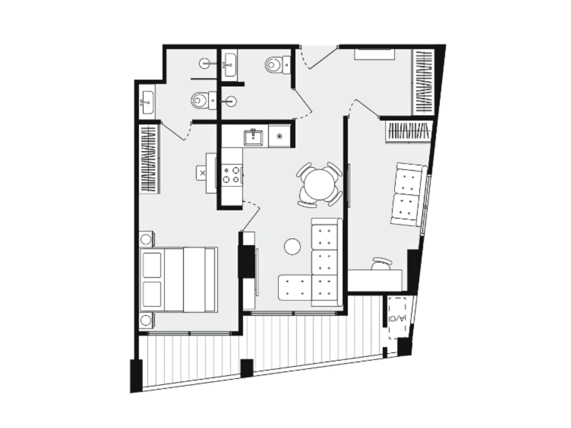 Современная функциональная планировка: светлая гостиная-столовая, совмещённая с компактной кухней, отдельная спальня и дополнительная комната, которую можно использовать как кабинет или гостевую. Вместительные встроенные шкафы у входа и просторная лоджия вдоль фасада обеспечивают удобство и много естественного света.