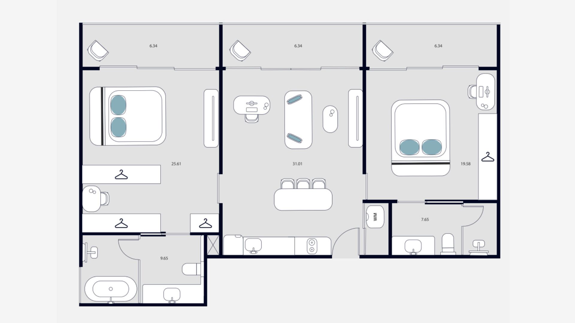Светлая и функциональная двухкомнатная квартира с открытой кухней-гостиной и островом в центре, которая плавно разделяет зоны отдыха и приготовления пищи. По бокам расположены две изолированные спальни с гардеробными, есть два санузла (один с ванной) и место для стиральной машины. Просторная лоджия на всю ширину квартиры добавляет комфорта и дополнительные зоны для отдыха.