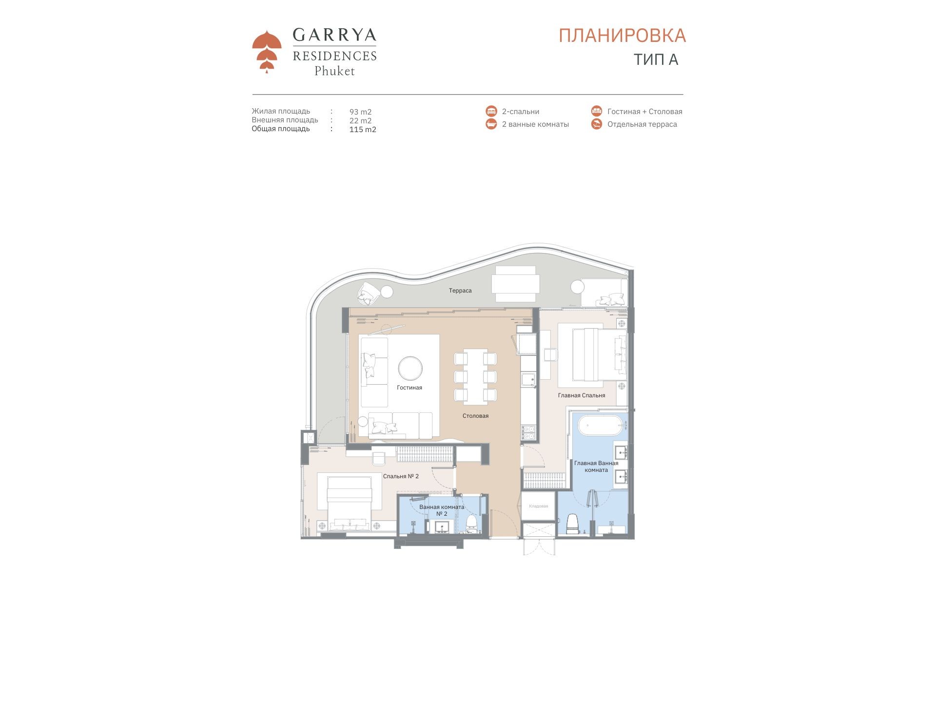 Просторная 2‑комнатная квартира площадью 115 м² (жилая 93 м² + терраса 22 м²) с открытой гостиной‑столовой и кухней - идеальное решение для комфортной жизни и приёма гостей. Главная спальня с собственной ванной, вторая спальня и ещё одна ванная обеспечивают приватность, а отдельная терраса приглашает отдохнуть на свежем воздухе.