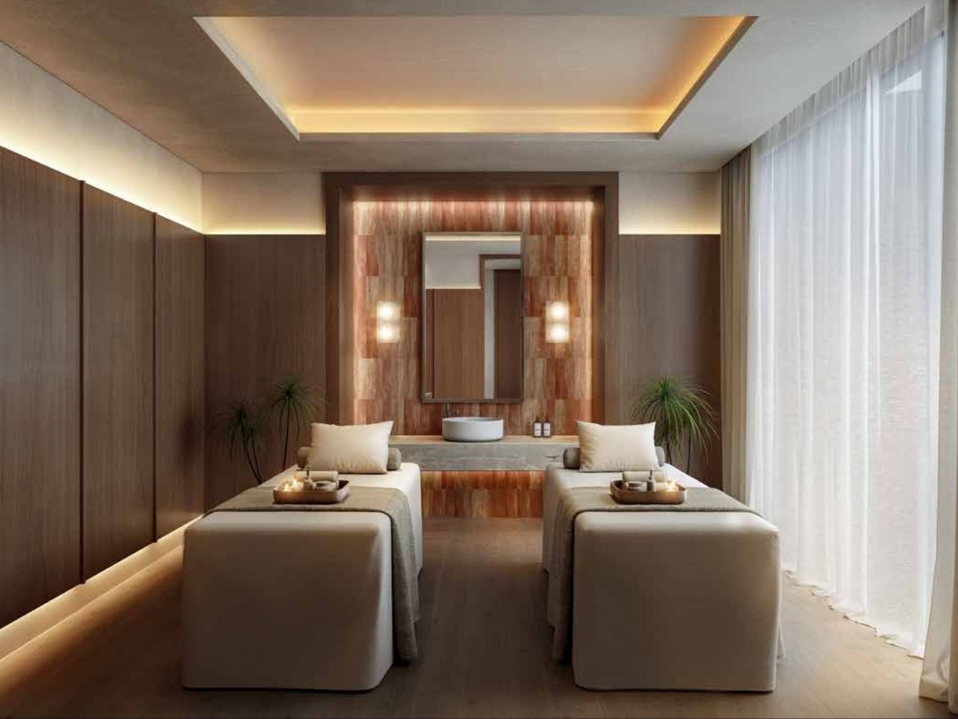 В центре расположена гостиная с кухней и обеденной зоной, а по обе стороны - две изолированные спальни, каждая со своей ванной комнатой. В главной спальне предусмотрена полноценная ванна, что встречается редко для апартаментов данного класса. Интерьер выполнен в светлых природных тонах, а панорамные окна наполняют пространство светом и создают ощущение воздуха. Эта квартира создана для комфортного проживания семьи.