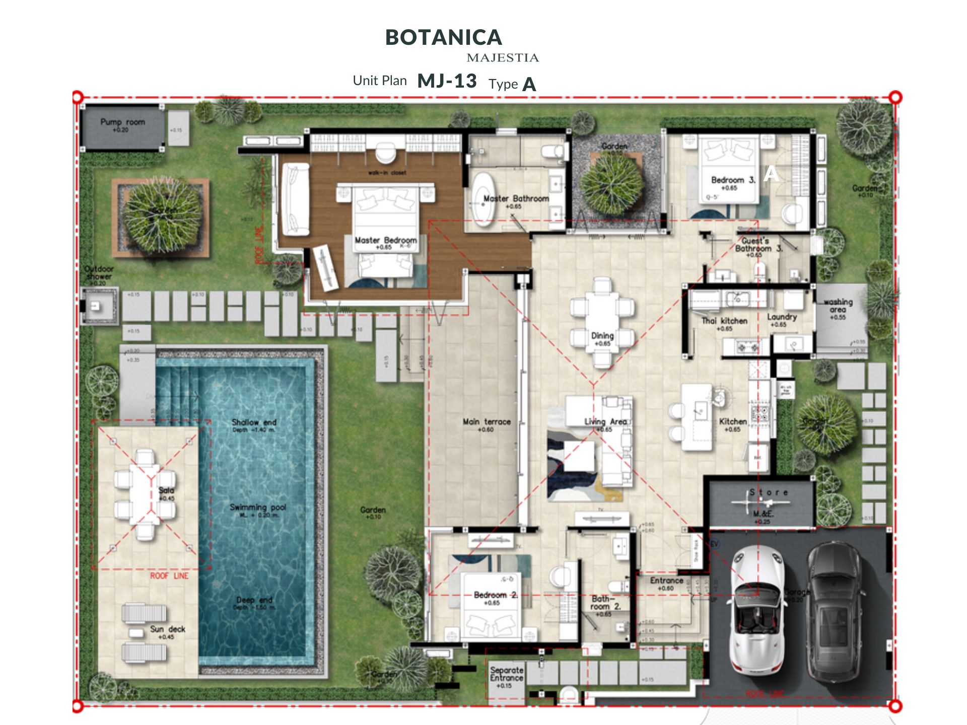 Просторная вилла с открытой зоной гостиной и столовой, совмещённой с современной кухней и отдельной «тайской» кухней, с выходом на большую террасу и ухоженный сад. В планировке - мастер-сьют с гардеробной и собственной ванной, две дополнительные спальни с санузлами, прачечная и кладовая, гараж на два автомобиля, во дворе - большой бассейн с зоной для загара и беседкой.
