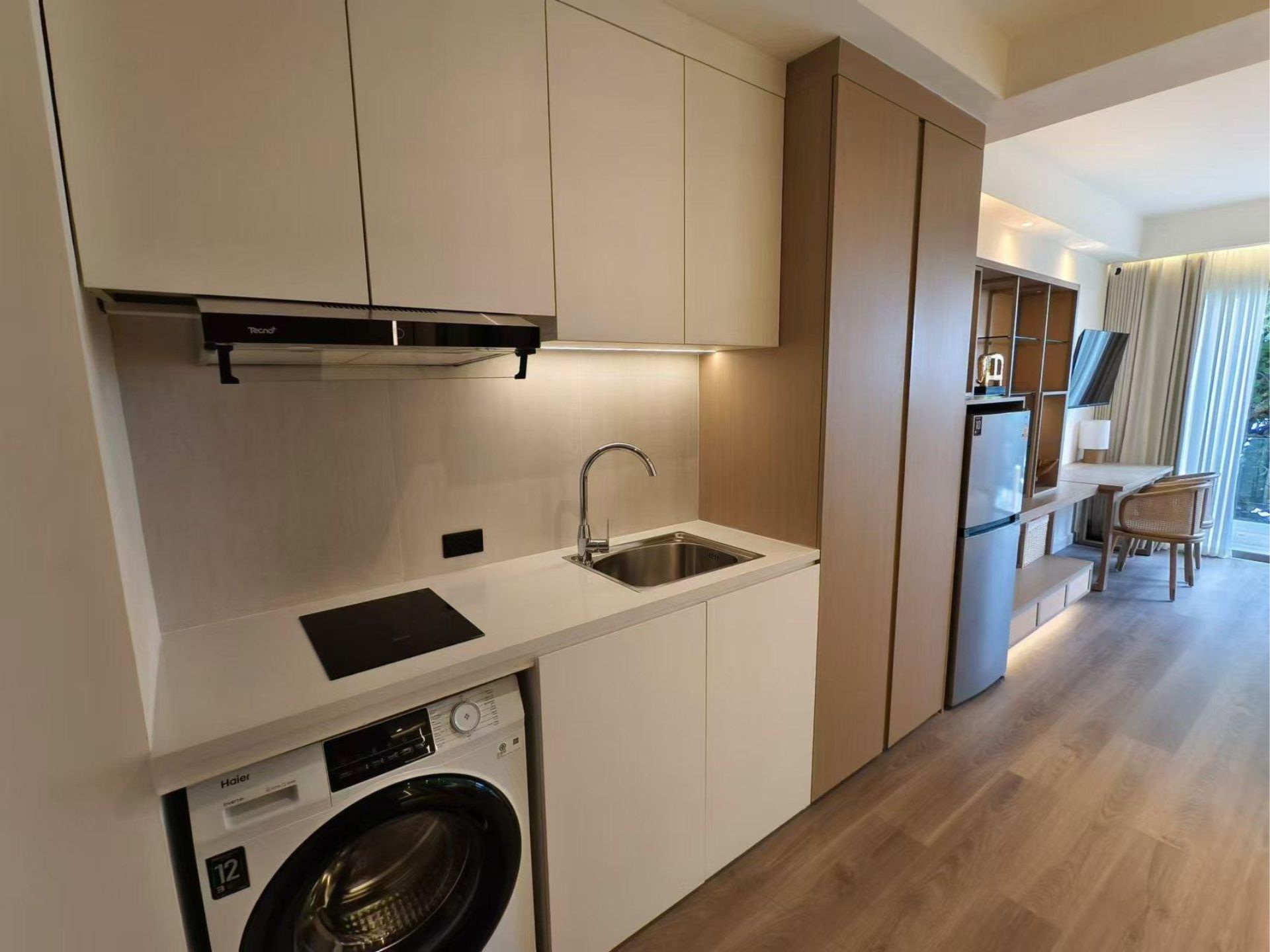 Студия спроектирована с максимальной функциональностью и комфортом. При входе расположена компактная кухня с удобной рабочей зоной и местами хранения, плавно переходящая в зону отдыха и сна с просторной двуспальной кроватью. Большие панорамные окна наполняют помещение естественным светом и открывают вид на бассейн и внутренний двор.